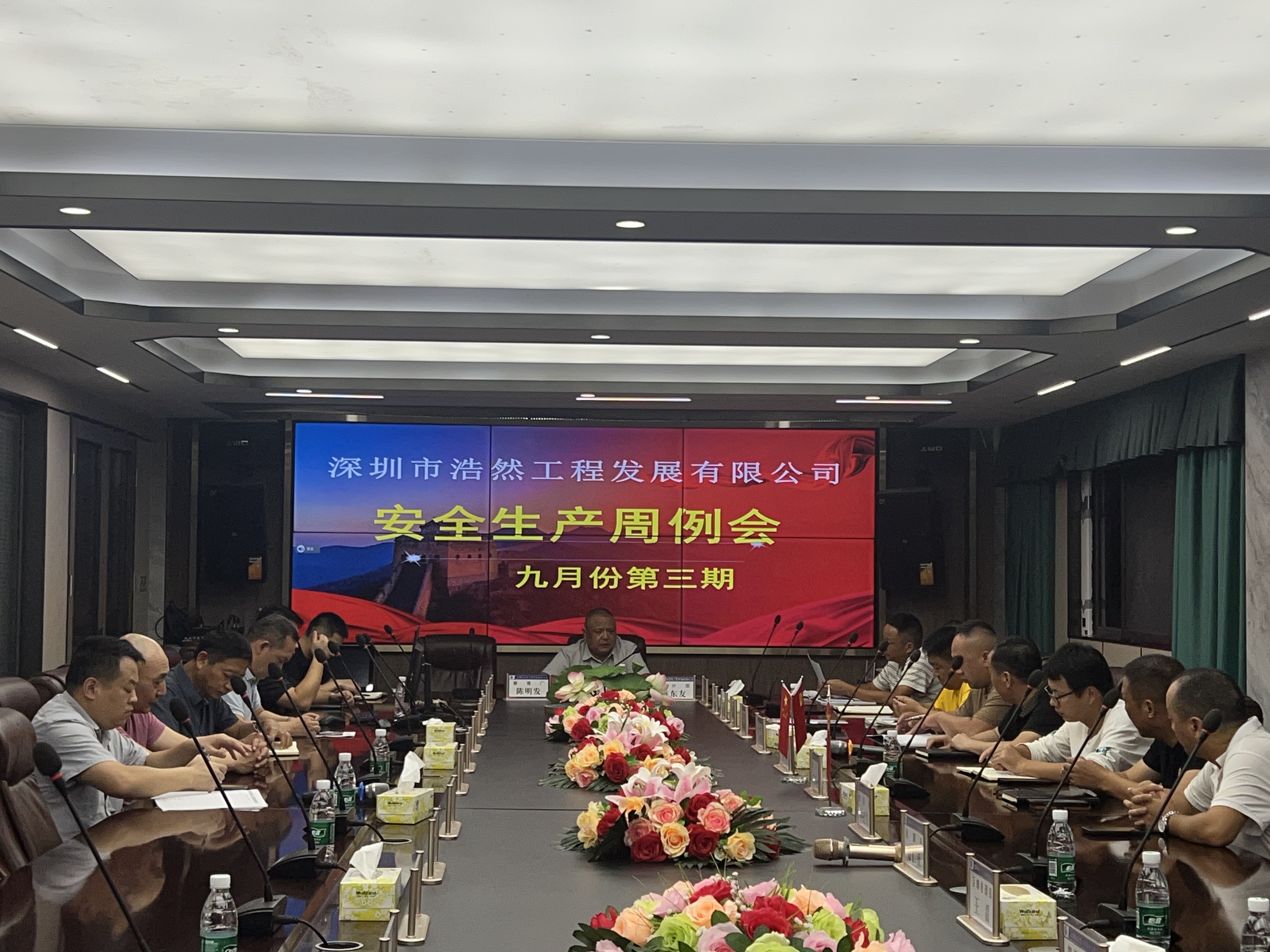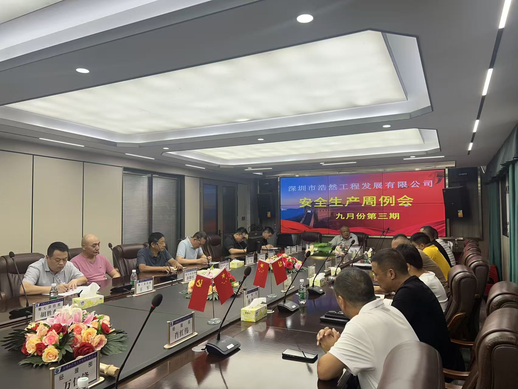2025年9月20日下午19:00,深圳市浩然工程发展有限公司在基地会议室召开了九月份第三期安全生产周例会。总经理肖红伟、副总经理万仁锋、汤国庆及各部门主要负责人参加了此次会议。